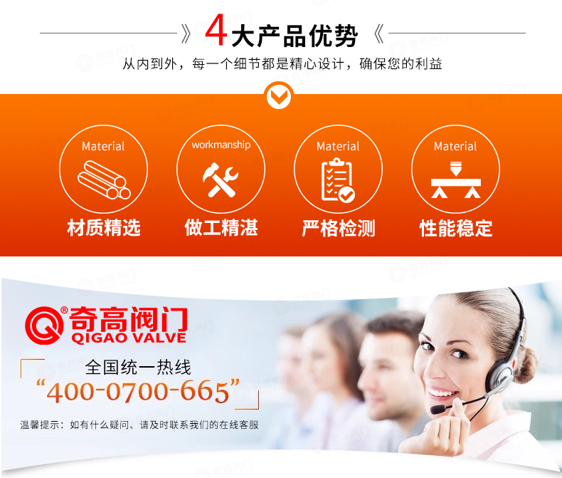 “奇高阀门”的期望,不断提升服务质量,精益求精,“真诚的服务”是“奇高”永恒的主题。“奇高”严格按照IS09001-2000 质量体系认证要求,质量严格把关, 责任到人,确保生产、销售、服务的健康运行。加强与用户沟通,竭诚为广大客户提供优良产品,贴心服务。特此我厂做出以下承诺: